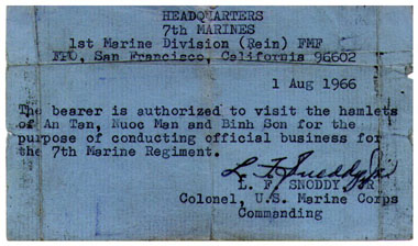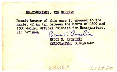 ![]() | This pass was for entry to the nearest Hamlet of An Tan for HQ Co. business during the hours indicated. |