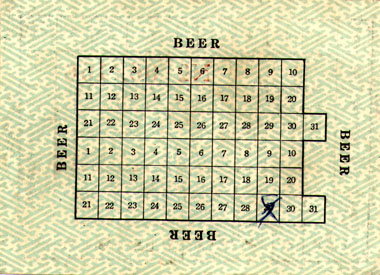 ![]() | Thirty-one squares to be marked on the front, and the same amount on the reverse of the card for each beer consumed. This is one of my cards, note the beer consumption!!! |
