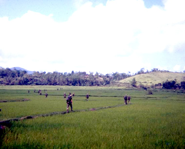 ![]() | Marines traversing flooded rice paddies walking along dikes to firmer terrain. |