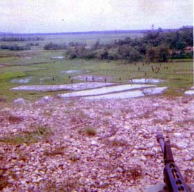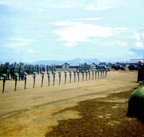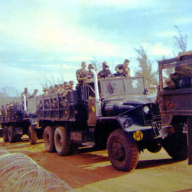 |  | First Battalion formation and Memorial Service on Hill 55, for LtCol. Dowd and 21 of his men that were KIA. |  | LtCol. Bethel, One Seven Commanding Officer on Hill 22. |  | From behind an M-16 "Bravo" Company Marines on a sweep crossing rice paddies in Dai Loc District. |  | Truck convoy moving Charley Company Marines from Hill 55 to FSB Ross. |