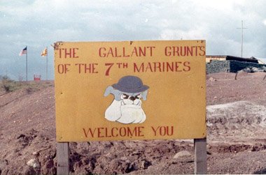 ![]() | Sign on Hill 55 greeting all who arrived to the 7th Marines HQ. Note the flags to the right of the sign at the top of the hill. |