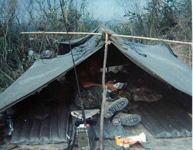 ![]() | On the ridge, poncho hootch and rubber "bitches" for comfort, just like home. Happiness is a dry bunk, "bitches" can float! |