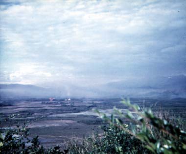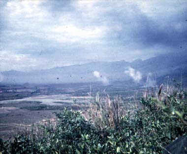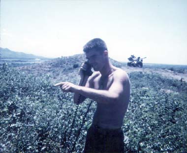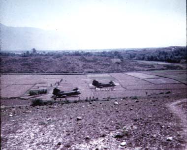 |  | Two CH-46A's in dry rice paddies preparing for lift off after transporting 3d Battalion Marines for an operation. |  | Ken Gould on a PRC-25 [Ken was the Battalion Co's radioman], note the M48A3 in the background. |  | Helicopters on the way into the Arizona, Que Son mountains in the background. |  | Arty HE prep of the Arizona operational area prior to the Marines landing for a sweep. |