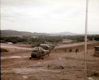![]() | Two UH34D's on the Hill 37 LZ. [note the "two holer" to the right, not a place to be "resting" when the Chopper land.] |