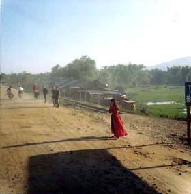 ![]() | A young Vietnames girl in a traditional dress heading home. |