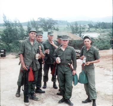 ![]() | [front row] Ernie Salgado (retired as a SgtMaj.), Richard Kardinal (we arrived in Nam on the same flight), unknown Marine, [in the rear] Al Granados, Cpl. Bob Angle, and "Doc" Liekweg. |