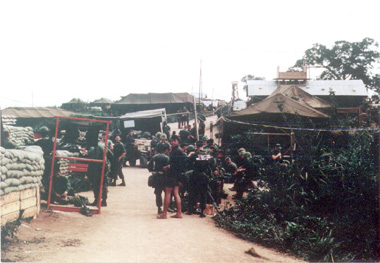 ![]() | "Doc" Reiber seated on the bench in the middle, Paul Light (the rocketman) in the bush hat on the end. Ron Hires standing to the right of the Marine with no helmet wearing a pack, John Mills (retired as a SgtMaj) with the M-79 in suspenders to the right of Hires. Anyone recognize himself? |