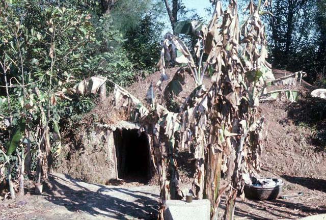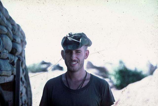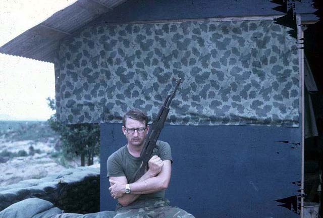 A corpsman with a captured AK-47 in front of the BAS quarters on LZ Baldy. |