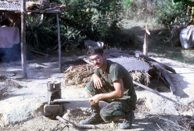 Delta Marine cooking dehydrated "pork-chop" in the field. |