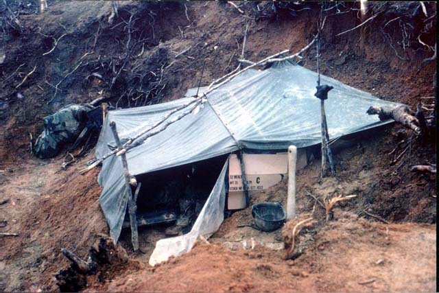 Empty "C" rat boxes to support the sides of a Marine shelter.