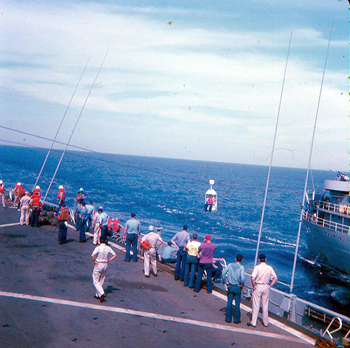 ![]() | With two ships along side a sailor is being transferred across in a carrier from one ship to another. This maneuver could get tricky during rough weather. |