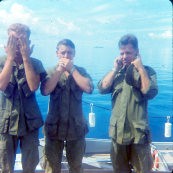 ![]() | Albert and his friends "See no evil, speak no evil and hear no evil". Davis, Myres and Albert La Valee on board a ship. |