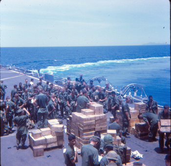 ![]() | Marines on deck of an LPH with stacks of C rats which will be loaded on helicpters for resupply or leave with them on a combat operation. |