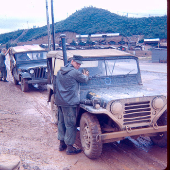 ![]() | Albert cleaning off the mud from the windshield of a Might Mite. The red soil either became a clouds of dust or sea or red mud depending on the season. |