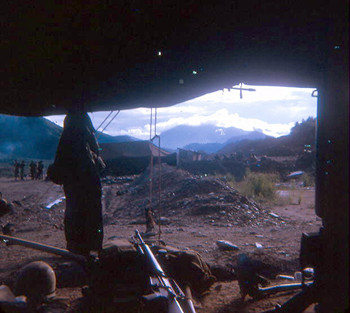 ![]() | Photo taken from inside a GP tent looking out as a day may have started. Notice the almost empty "Lister" bag in from, the helmet and M-16. |