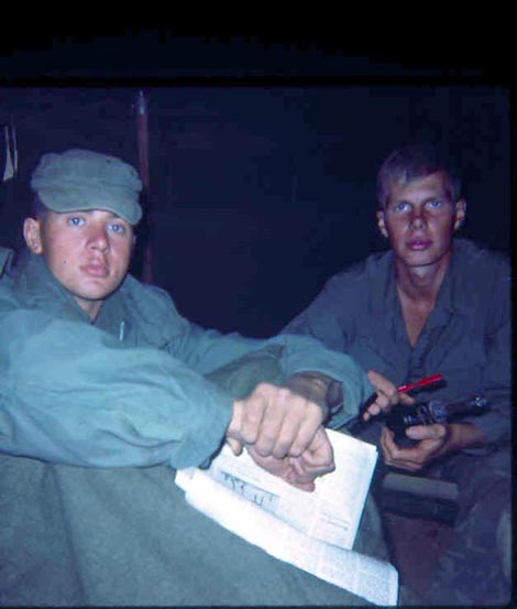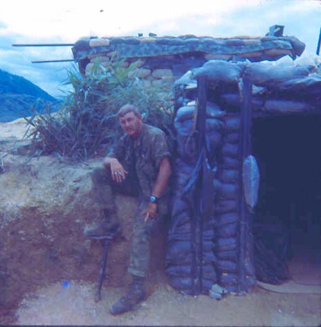 ![]() | Corpsman Gary L. Barnes of Fox Co. near the entrance to our bunker. |