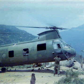 ![]() | A CH 46-D ready for lift-off after resupply to Fox Marines on a mountain top out post. |