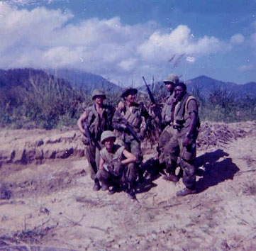 ![]() | [ Kneeling in front, Frank Keiper ] The rest unidentified Marines either returning or leaving on a combat patrol. |