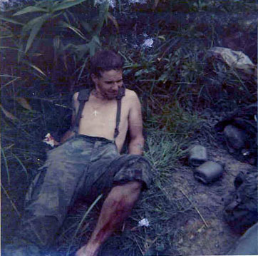 ![]() | Terrance Mulrean with his bleeding leg after removing the leeches picked up on patrol. |