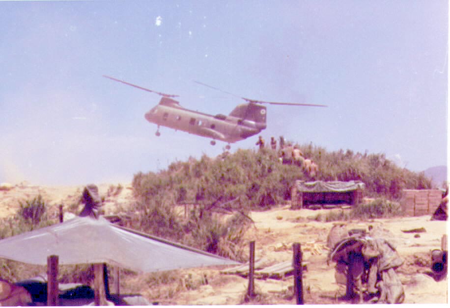 A CH-46 Resupply Helicopter arriving at FSB Ryder.