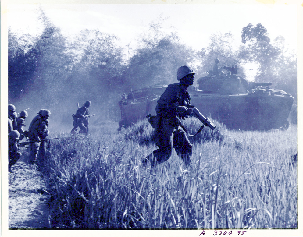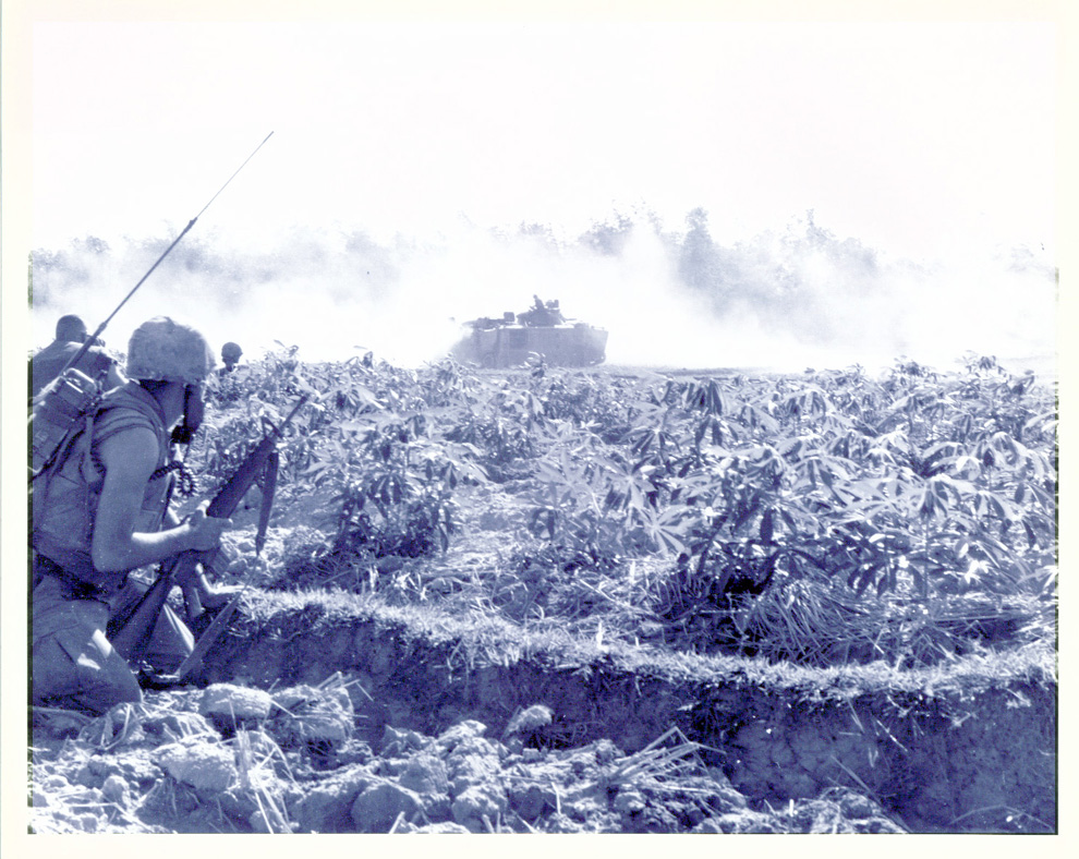 DOD USMC PHOTO: A370095 20 June 1967 FLESH AND STEEL - With armour support in the background Marines of "E" Co. Second Battalion, 7th Regiment Marines advance against dug-in enemy automatic weapons positons during Operation Arizona 14 miles isouth of Da Nang. |