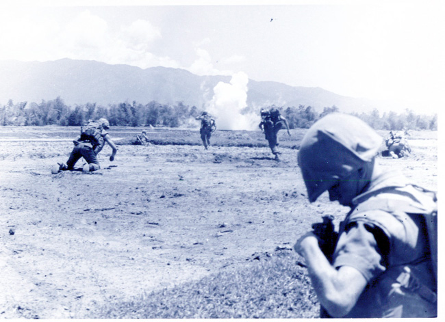 DOD USMC PHOTO: A370131 June 1967 - Marines from Echo Co., Second Battalion, Seventh Regiment double timing across a dry rice as incomming mortars rain in southwest of Da Nang during Operation Arizona. |