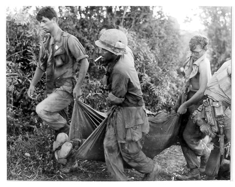 DOD USMC PHOTO: J.E. McClory June 1967 - Marines from "E" Co., Second Battalion, 7th Marine Regiment carry a fallen Leatherneck to a MedEvac chopper from HMM - 362 on Operation Arizona 25 miles southwest of Da Nang. |