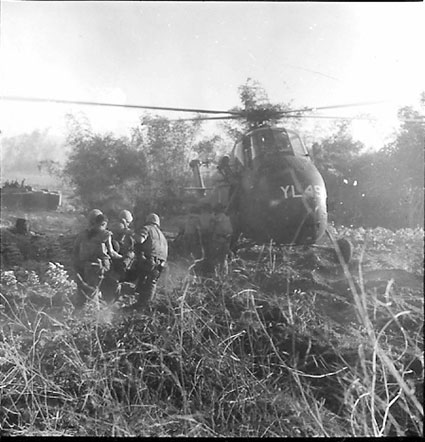 DOD USMC PHOTO: A370133 June 1967 - Echo Co., Second Battalion, 7th Regiment Marines ( GySgt Alphonso Malave with a cigarette) carry a wounded comrade to a MedEvac chopper on Operation Arizona 25 miles southwest of Da Nang. |