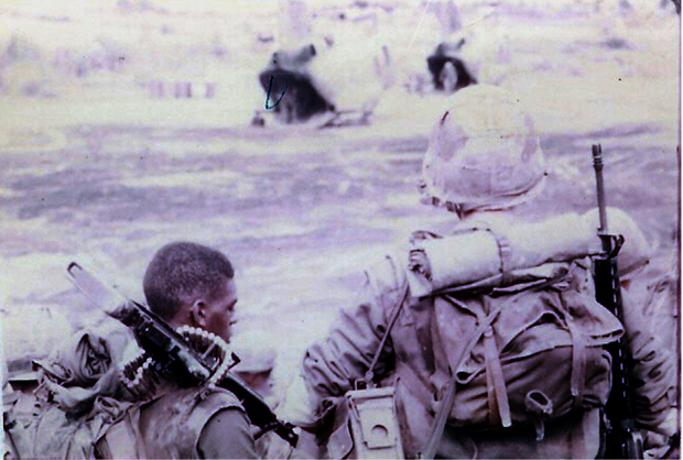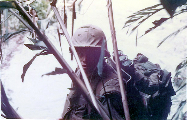 DOD USMC PHOTO: SSgt J.T. Purcell Dec 1967 - A Marine mortarman from Echo Co, Second Battalion, 7th Regiment moves warily along the bank of a sluggish river south of Da Nang during a search-and-clear swwep on Operaion Pitt. |