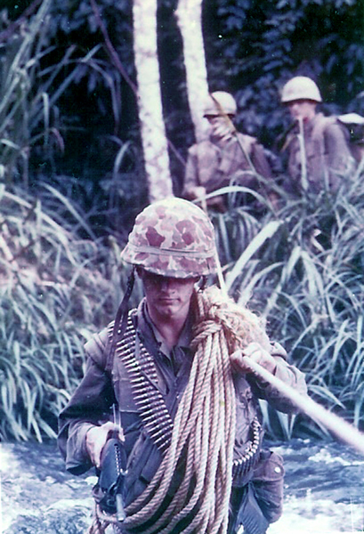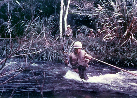DOD USMC PHOTO: SSgt J.T. Purcell Dec 1967 - An Echo Co., Second Battalion, 7th Regiment clings to a lifeline and plows across a surging mountain stream southwest of Da Nang during Operation Pitt. |