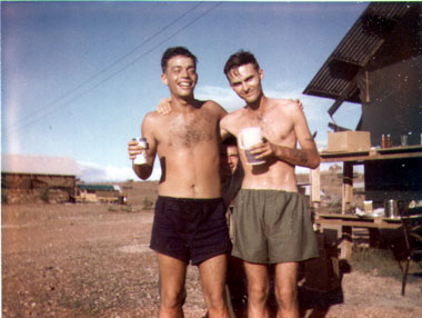![]() | My friend Marine Myron J. DiVittorio [on the left] and myself having a "beer" near our "condo" on Hill 55 1967. |