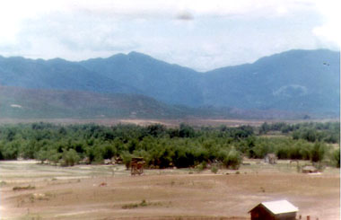 ![]() | View westward, the outer perimeter, and the inpossing mountain range of "Charlie Ridge" from Hill 55. |
