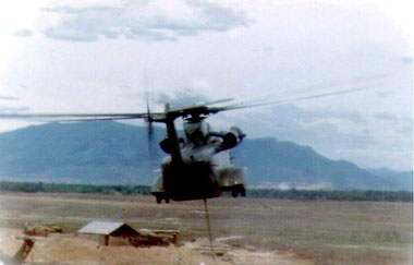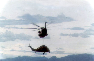 ![]() | A 53 hooked to a 34 which has been disabled lifting off from the vicinity of the Helipad on Hill 55. |