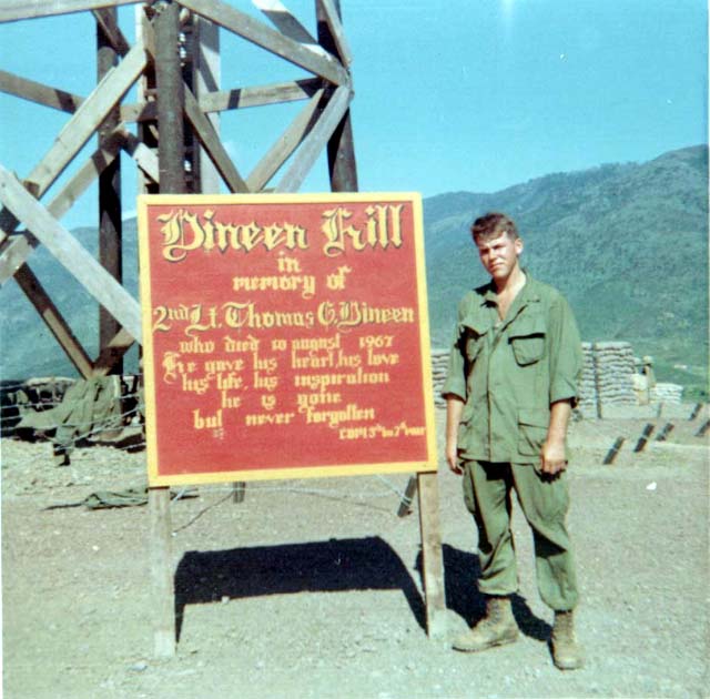 ![]() | "Ozzie" Wotchko near the sign erected on Hill 25 in honor of Lt. Thomas Dineen who was KIA near it's location. |