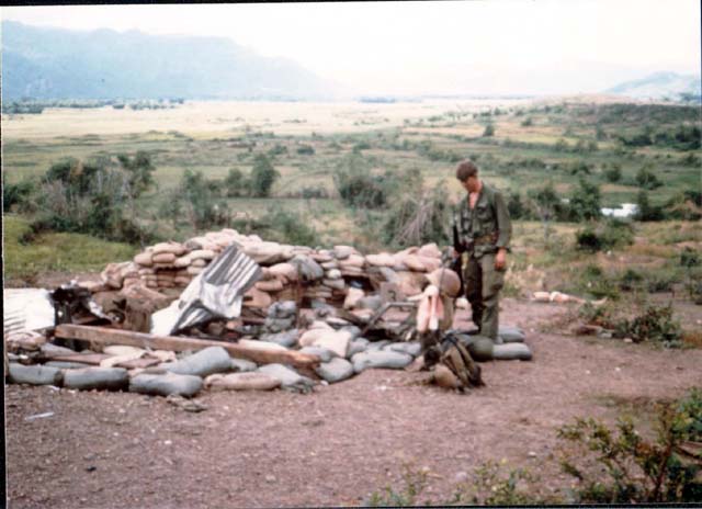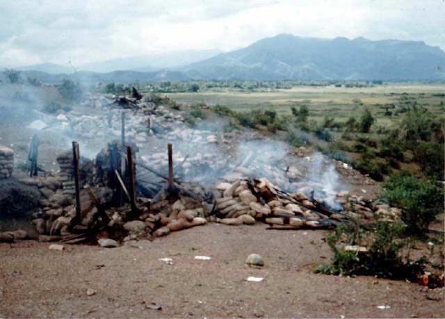 ![]() | Smoke still rising from the destroyed sandbagged bunker on the hill. |
