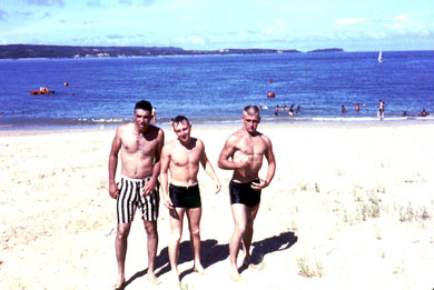 Life was tough, especially the "combat swimming" tests in Okinawa! [Left to right] John A Milbauer, Reno Morgan, Bertel E Serfes. |