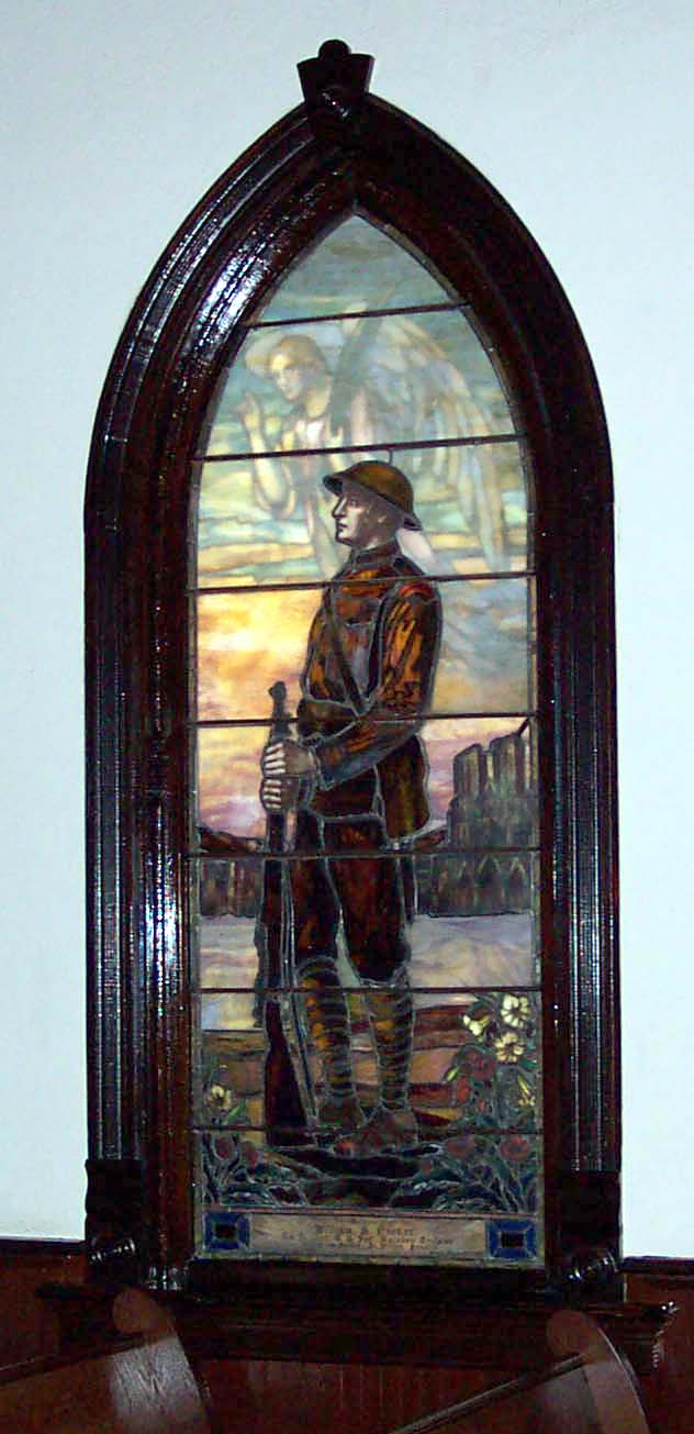 The window is dominated by a standing soldier in his World War One uniform, a Doughboy, who is holding his Springfield '03