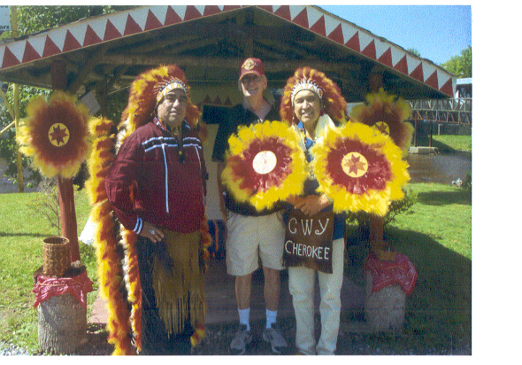"Big Chief" Tom Hanneman flanked on either side by Native Americans in Cherokee.