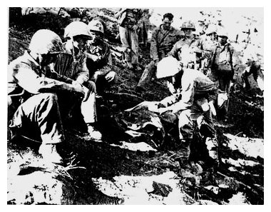 Top Row, L-R: Pfc Fred P. Frankville, Pfc Johnnie Evans, Cpl Arthur J. Weisberger, Lt David McKay, Pfc Richard J. Curtin, HN James W. Hartley.