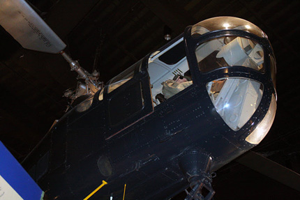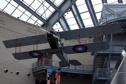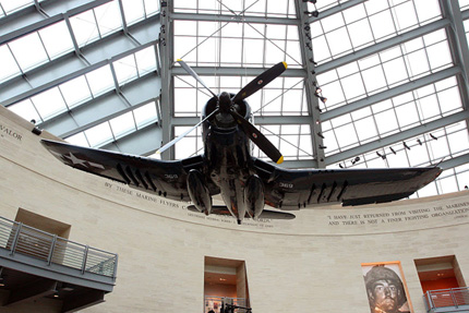 An F4U Corsair and a WWI biplane hanging in the Museum