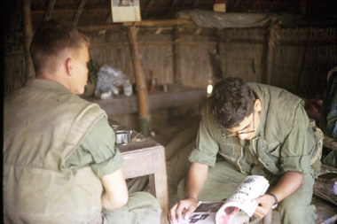 ![]() | Marines taking a break in a "hootch" and catching up on the "news". |